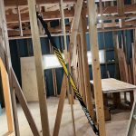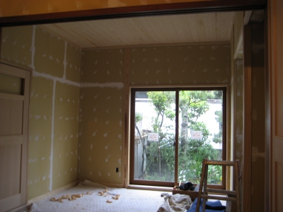 左官さんが漆喰を塗る前の下地処理を施して、今日は丁度建具屋さんが建具の吊り込みをしている最中でした。