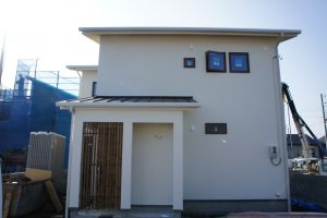 白い塗り壁に無垢板の軒天、玄関ポーチの木格子、木目調の樹脂サッシが馴染んで良い雰囲気に出来上がりました。